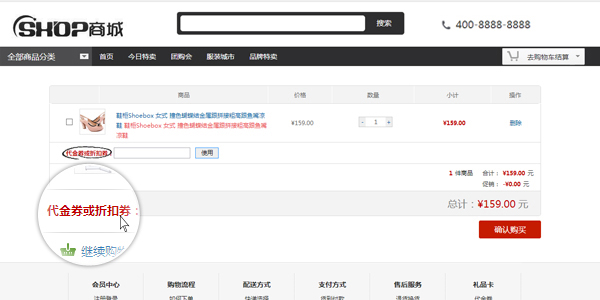 1、商品确认后,输入购物卡编码,点击“使用”,商品价格自动调整,点击“确认购买”;