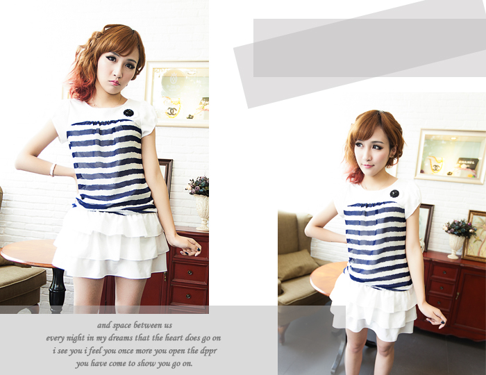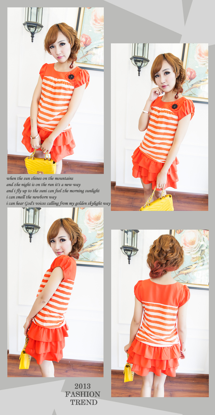 主图来源: 自主实拍图货号: 1311018风格: 通勤组合形式: 单件裙长: 超短款式: 其他款式袖长: 短袖领型: 圆领袖型: 包袖腰型: 中腰衣门襟: 套头裙型: 蛋糕裙图案: 条纹流行元素/工艺: 荷叶边 亮片 印花品牌: Hot City面料: 雪纺成分含量: 95%以上材质: 涤纶适用年龄: 18-24周岁年份季节: 2014年夏季颜色分类: 蓝色 桔色尺码: S M L XL