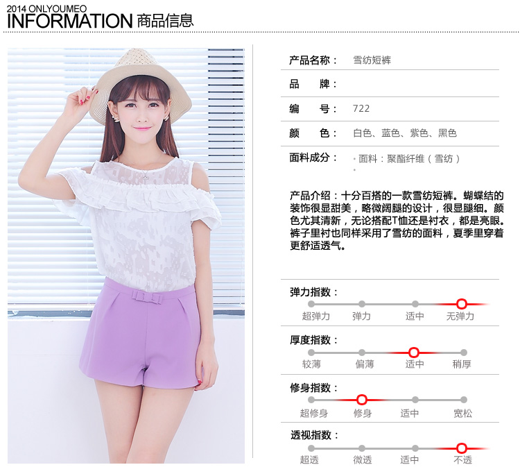 主图来源: 自主实拍图货号: 722裤长: 短裤/热裤女裤腰高: 中腰面料: 其他风格: 通勤通勤: 韩版颜色分类: 黑色 紫色 白色 天蓝色尺寸: 9(适合平时穿26/27) 11(适合平时穿28)年份季节: 2014年夏季