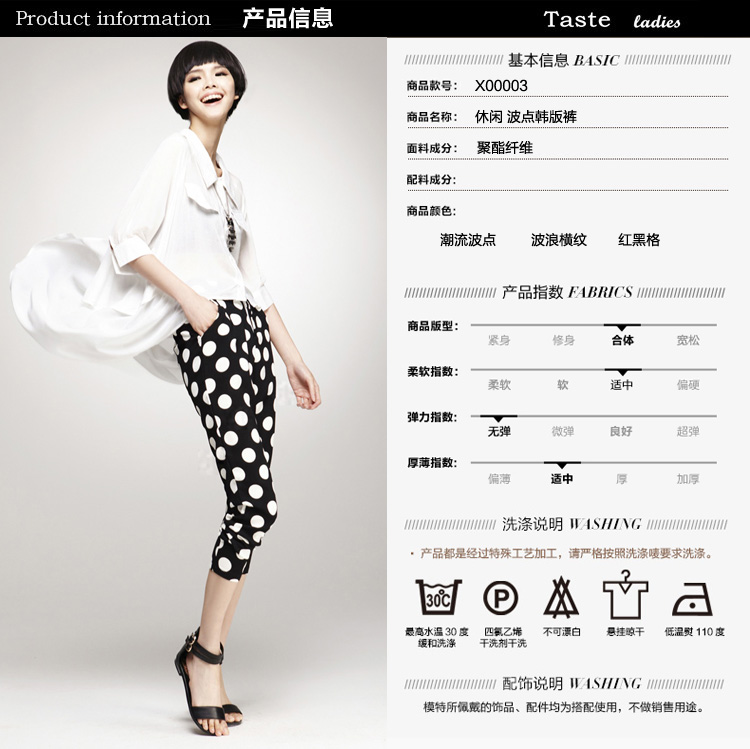 主图来源: 自主实拍图货号: X00003女裤裤型: 哈伦裤裤长: 七分/九分裤女裤腰高: 低腰风格: 通勤通勤: 韩版颜色分类: 潮流波点 红黑格 波浪横纹尺寸: S M L XL XXL成分含量: 91%(含)-95%(含)服装款式细节: 印染厚薄: 薄款价格: 130-169元年份季节: 2014年夏季