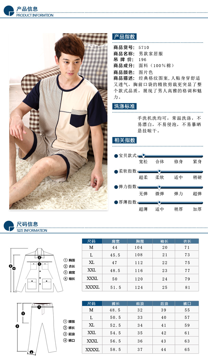 上市时间: 2014年春夏季是否商场同款: 否适用场景: 休闲家居适用对象: 青年品牌: 雪尔绵款号: 5710颜色分类: 纯棉5710 纯棉5709 纯棉5711 纯棉5708尺码: M(100%纯棉) L(100%纯棉) XL(100%纯棉) XXL(100%纯棉) XXXL(100%纯棉) XXXXL(100%纯棉)件数: 2件面料俗称: 针织棉面料面料主材质: 棉成分含量: 95%以上主面