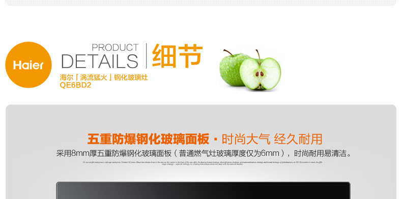 海尔创新【涡流猛火】燃气灶,独特通道增氧技术,4.2KW澎湃火力,五重防爆玻璃面板,高效劲燃,节能30%以上。