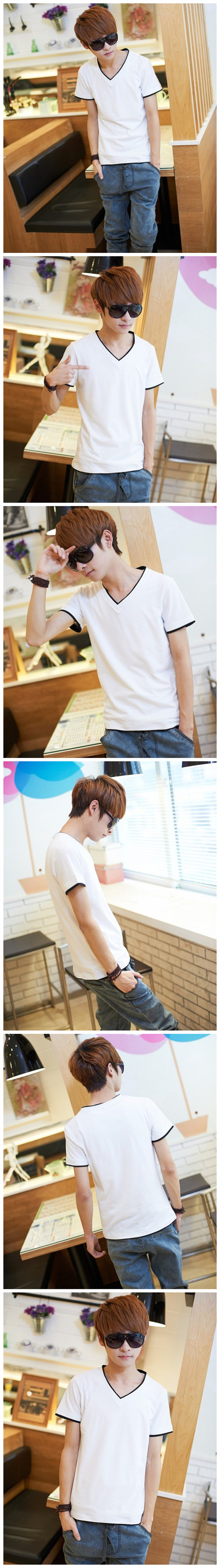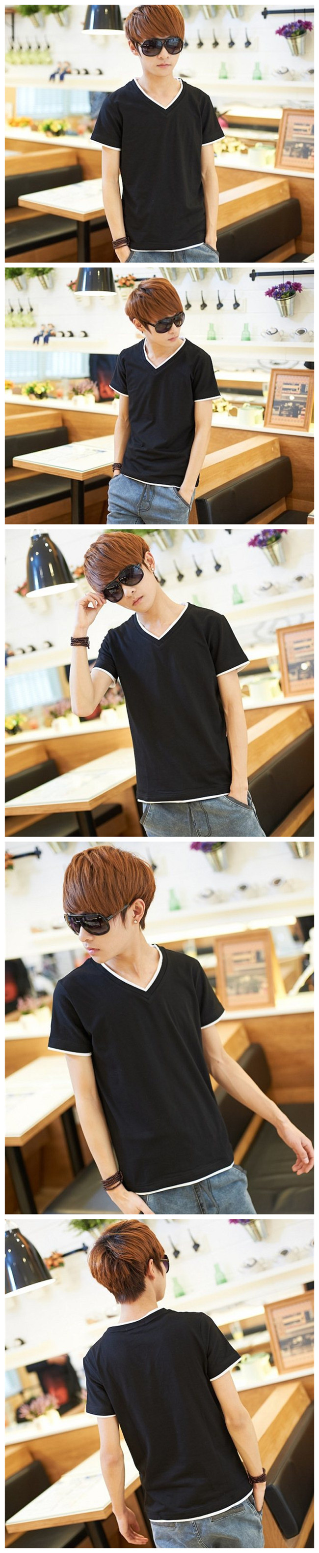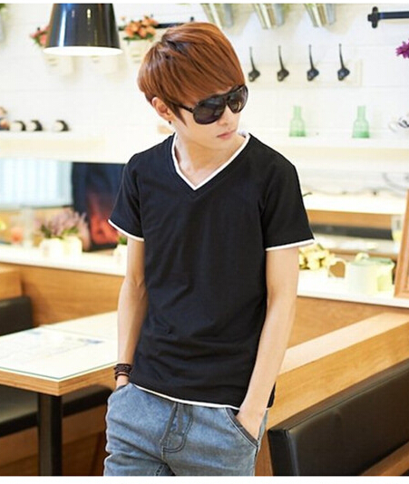 青少年男士修身纯色V领短t恤