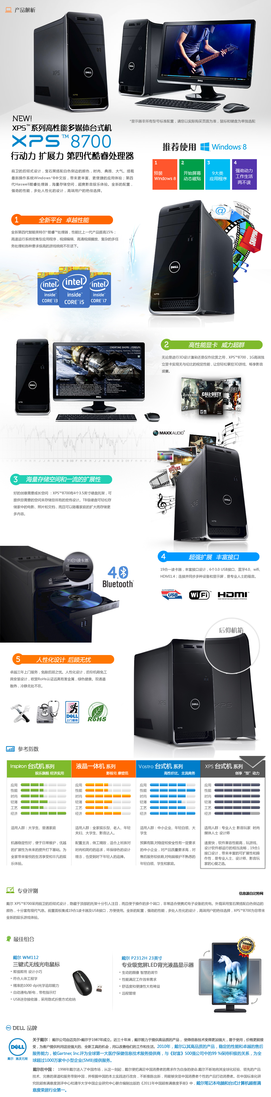 商品描述Dell 戴尔 XPS 8700-R368 台式电脑(i5-4440 4G 1T DVDRW Win8 1G独显 S2340L显示器 3年上门服务 19合1读卡器 USB3.0 Wi-Fi 蓝牙4.0)