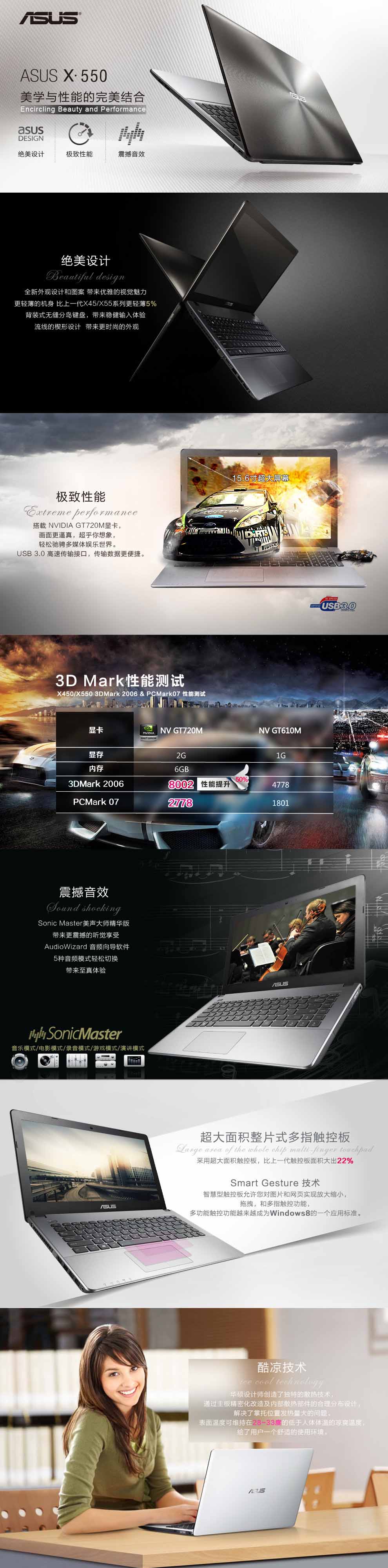 - 全新X550VC搭配华硕独家的SonicMaster Lite 音效技术,能呈现出更浑厚的重低音和更震撼的剧场环绕效果,打造全方位立体声的逼真音效,为用户带来全新视听体验。