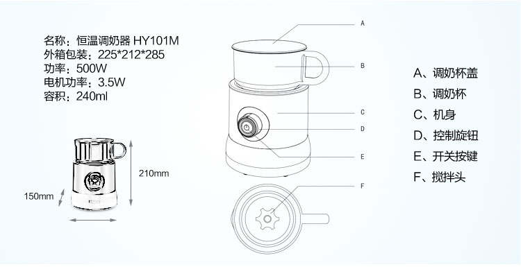 消毒锅包装箱尺寸 450*290*420 搅拌机包装箱尺寸 340*180*335 调奶器包装箱尺寸 225*212*285 消毒锅外形尺寸 310*204*395 搅拌机外形尺寸 175*168*326 调奶器外形尺寸 180*150*210 消毒锅容积 6套 搅拌机容积 搅拌杯:720ml 湿磨杯:400ml 干磨杯:250ml 调奶器容积 240ml 消毒锅功率 1300W 搅拌机功率 260W 调奶器功率 500W;电机功率3.5W 搅拌机高度 搅拌杯195mm 湿磨杯130mm 干磨杯110mm 底座150mm
