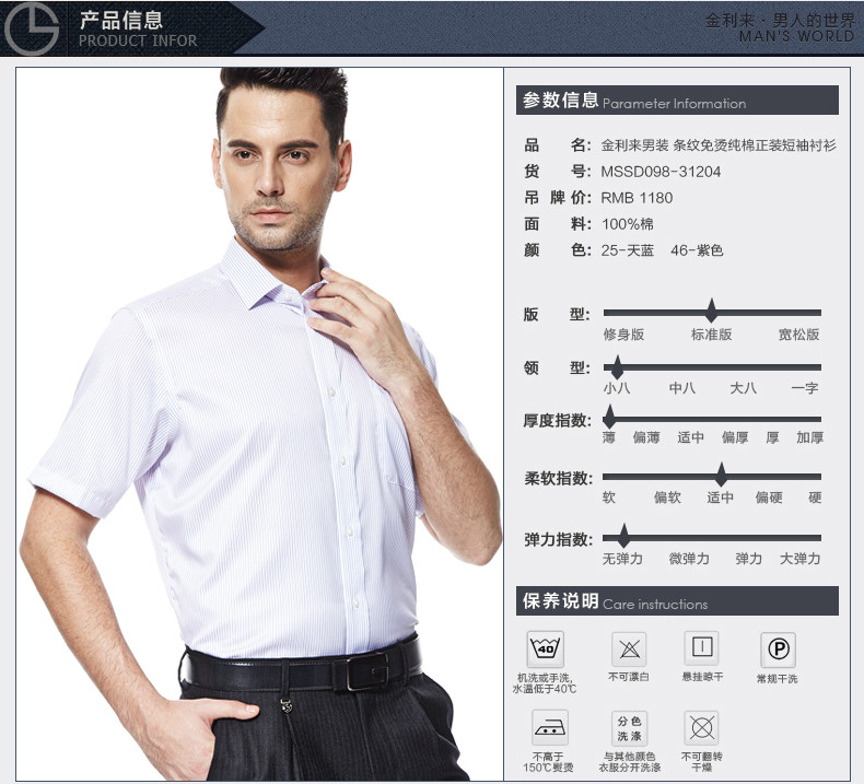商品名称: 2014新款 纯棉免烫正装短衬 ...商品编号:1094855321店铺:金利来旗舰店上架时间:2014-03-13 14:44:21商品毛重:500.00g商品产地:材质:棉款式:短袖领型:翻领